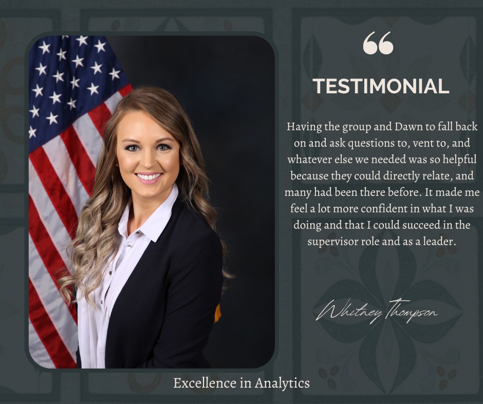 "My greatest achievement is recognizing my strengths and weaknesses and understanding what it takes to build and maintain a quality team. Teambuilding is highest on my priority list. Culture, teamwork and creating excellence is exactly what this program has helped me provide and I have a personal foundation and access to resources and support, and that feels incredible." - Jessica Y., Crime Analyst Leader, California