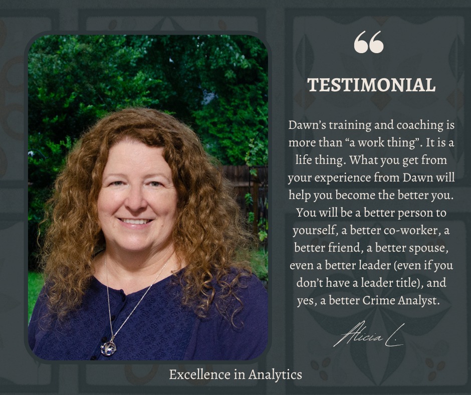 ✨Dawn is the author of the best-selling book “Bigger Than Data” – A Law Enforcement Analyst's Roadmap to Marketability, Professional Development, Fulfillment & Joy”. The lessons in this book have been instrumental in moving the law enforcement analytical professional into that of professionalism, excellence, and joy. In her second book, “Building a Crime Analysis Legacy. A law enforcement supervisor’s roadmap to building long-lasting, high-quality analytical capacity”, she helps supervisors build quality and sustainable analytical function that lasts.
