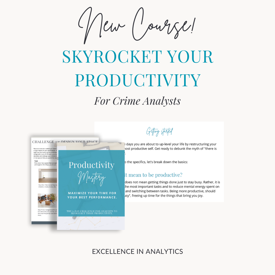 This 5-part Productivity Mastery Course for Crime Analysts is a virtual training at your own pace. This course is designed to transform the way you approach your crime analysis work and help you achieve the productivity and impact you’ve been striving for. Over the course of four videos and workbook, we will equip you with the tools and strategies to streamline your workflow, eliminate time-wasting tasks, and maximize your impact on your agency’s crime-fighting efforts.